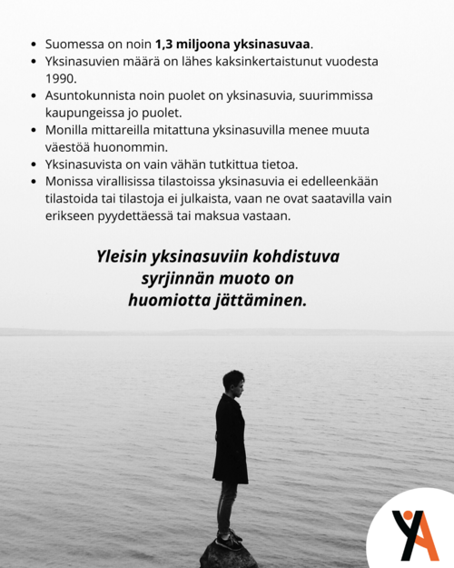Yksinasuvien valtakunnallisessa yhdistyksessä olemme todella huolissamme yksinasuvien yhdenvertaisuuden puutteesta yhteiskunnassamme. Monissa virallisissa tilastoissa yksinasuvia ei edelleenkään tilastoida. Yllä mainitut prosenttiluvut ovat Kelasta, Tilastokeskuksesta ja Terveyden ja hyvinvoinnin laitokselta erikseen pyytämällä saamiamme tietoja. Yksinasumisesta tarvittaisiin paljon nykyistä tarkempaa, virallista tilastotietoa poliittisen päätöksenteon tueksi ja julkisten palvelujen kehittämiseksi.